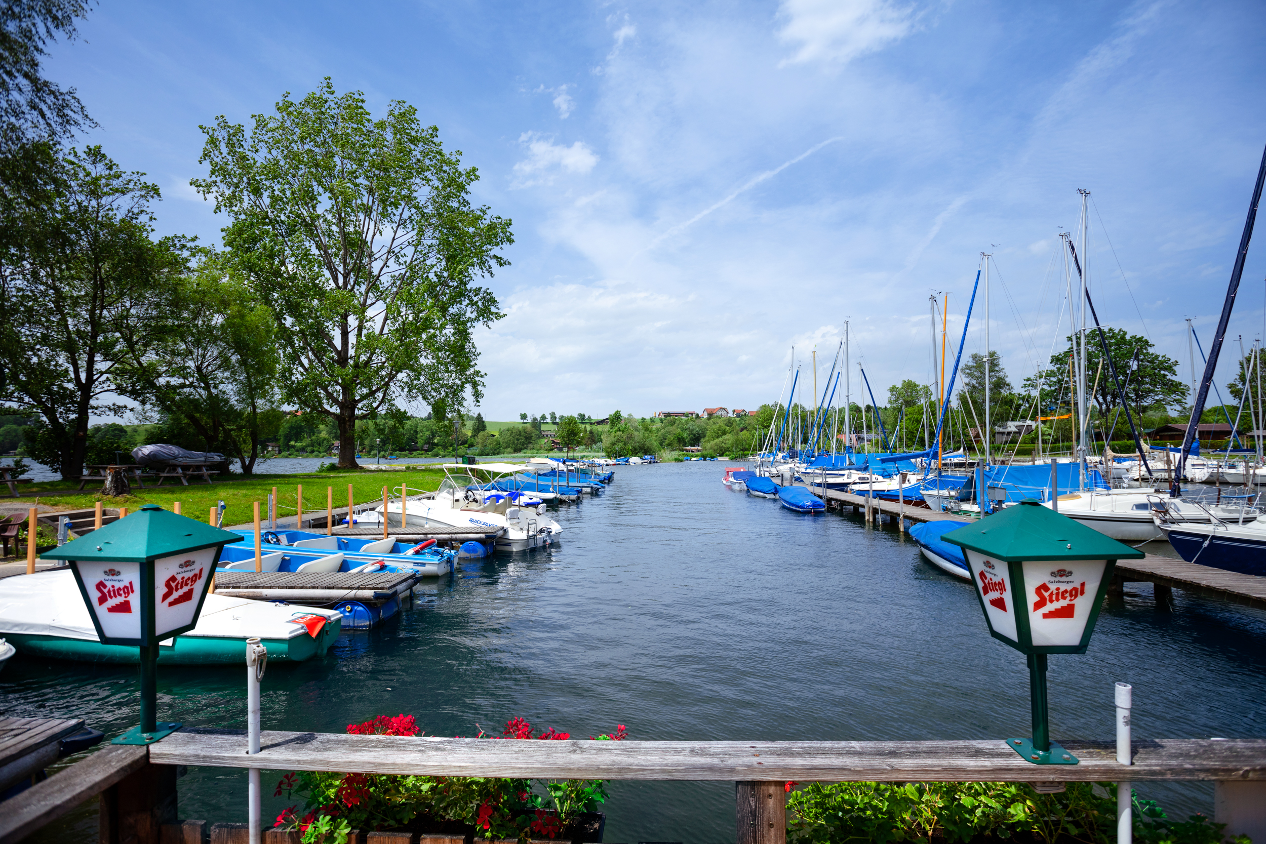 Die sich sanft wölbenden Wellen nehmen das Glitzern der Sonne huckepack. Gedankenverloren folgen wir ihrem Lauf, bis wir einen Ruderer entdecken, der die Schilfzone entlangfährt. Nun wollen wir auch wieder weiter hinaus auf den See mit unserem Tretboot. Auf geht’s! Mit aufgewärmten Beinen und dem eifrigen Ruderer vor Augen zieht es uns voran. Freilich nicht ganz hinaus – dort, wo wir in der Ferne die weißen Spitzen der Segelboote erspähen, die munter über die Wasseroberfläche ziehen. Aber immerhin ein gutes Stück weiter. In Sichtweite bereitet gerade ein Segelboot die Wende vor. Wie schnell das geht! Im Nu ändert das Boot seine Richtung. Wir lauschen, wie der Wind knatternd ins Segel fährt und die Segler mit Schwung antreibt. Schon zieht es das Segelboot wieder weg von uns, weiter hinaus auf den See.